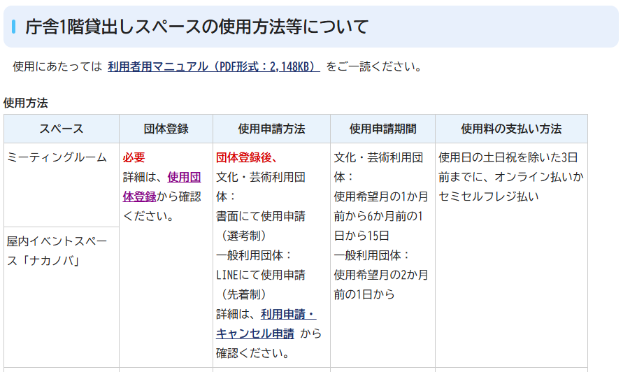 というわけで、さらっと公共施設の紹介が終わってしまいました。他にもウィメンズセンターなどみんなで使える施設の話もしたかったのですが、登録から利用に至るまで重複が多いし、説明が煩雑になりますので、次に行きます。